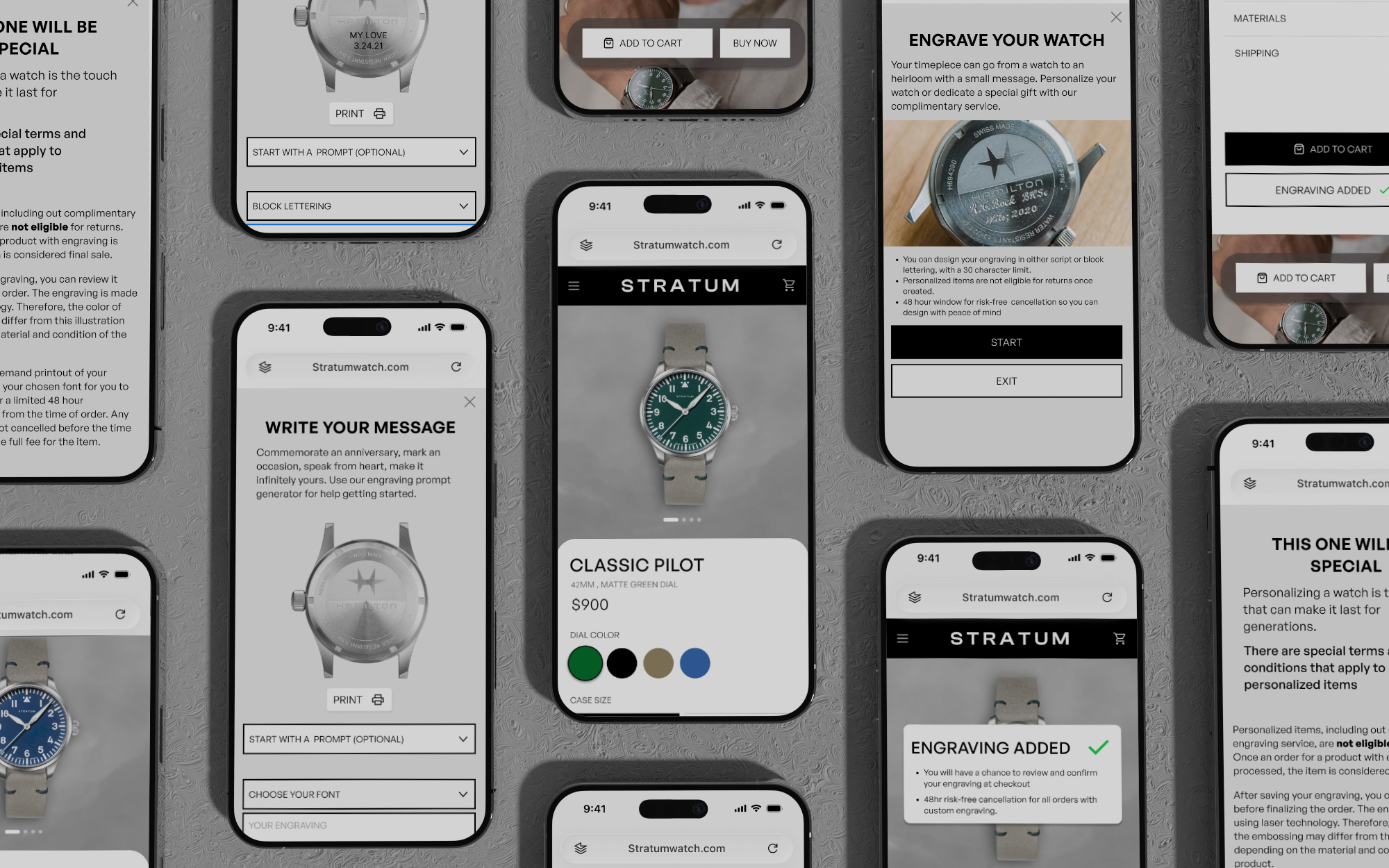 The luxury watch space is a large and varied place, with a lot of businesses vying for a the eyeballs of a few who want to invest in a special, and potentially very expensive, keepsake. Custom engraving on the caseback - a name or place, an important date, a meaningful phrase - is a way to add value to just the right user. There are quite a few brands that offer this as an online ecommerce experience, but from a competitive analysis of key competitors we found areas for Stratum to capitalize. My approach focuses on real-time on-watch engraving previews, a saved-draft + confirm checkpoint, and mobile-first ergonomics to reduce anxiety and drop-off.